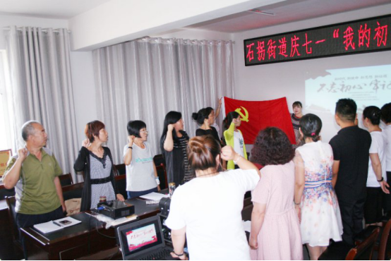 活动中石拐街道党工委书记李雅民同志带领全体参会党员重温了入党誓词,在鲜红的党旗下,全体党员举起右手、握紧拳头,庄严宣誓,重温了入党宣誓时的庄严承诺和坚定决心。